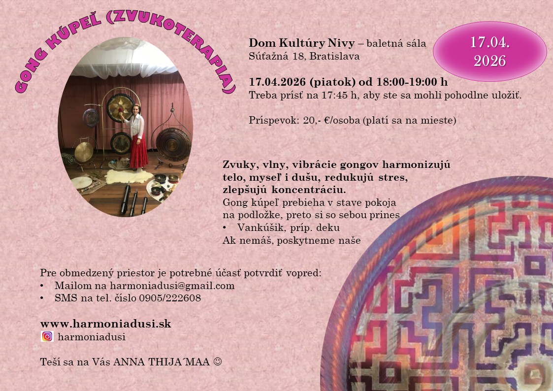 Doprajte si výnimočný zážitok, odvahu spoznať a zažiť nádherné zvuky gongov, ktoré svojimi vibráciami ti pomôžu zharmonizovať tvoje telo i dušu a navrátia Ti radosť do života.