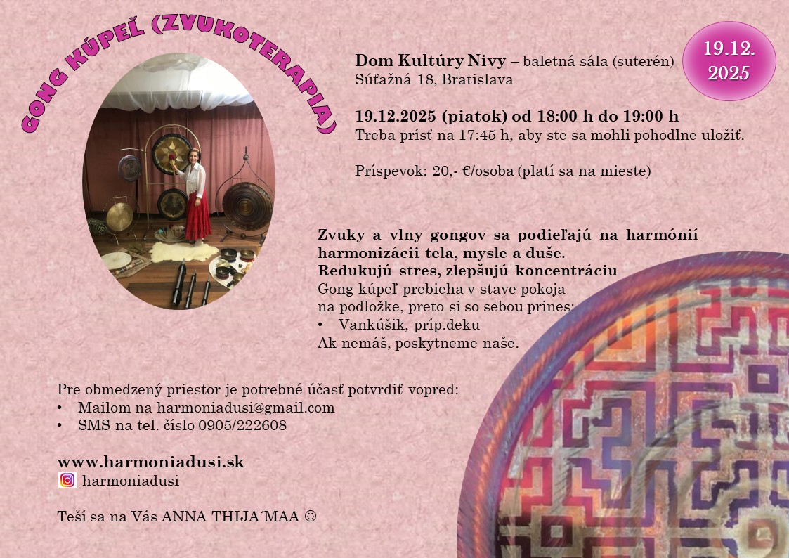 Soundhealingová gong procedúra patrí medzi najstaršie a veľmi účinné formy harmonizácie tela a mysle.Gong sprevádza ľudí po stáročia a slúži im vďaka svojim hlbokým zvukovým kvalitám aj duchovnému významu.